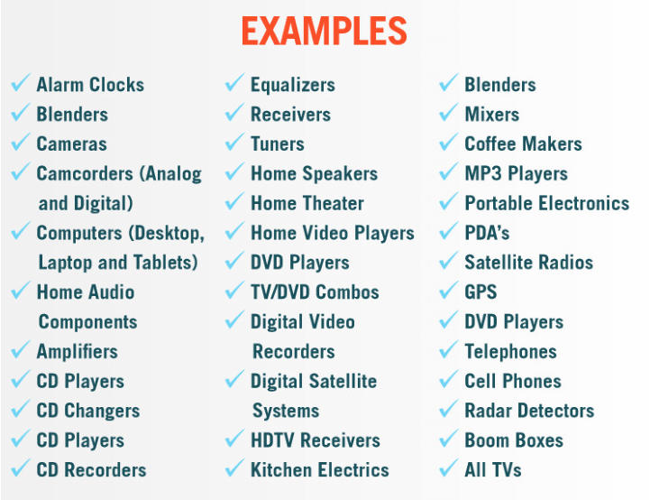 such as TVs, computers, mobile phones, tablets, blenders, stereos,